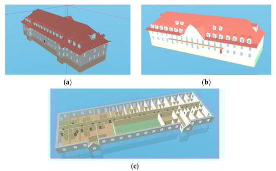 3D model of the analyzed building: (a) northwest corner of the building; (b) southeast view; (c) floor view with particular rooms.
