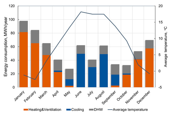 As mentioned in Section 2.4, the simulation results were compared with actual measurements in the building. Before the model comparison and calibration phase, a preliminary data analysis was performed. At this stage, the monthly energy demand was determined for the three systems already mentioned: heating and ventilation, cooling, and DHW. An example of the actual energy demand over the year by month is shown in Figure 5. In addition, the average outdoor temperature each month is presented.