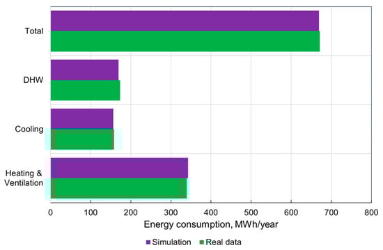 The next step was the verification of the energy model, which relied on comparing the actual measurements with the results of the calculations on an annual basis. Separately, the annual energy demand for each system and the total consumption for the entire building were determined. Figure 6 shows the results. The differences between simulated and actual values do not exceed 5%. It could be considered that the calculation results are reliable, and the model corresponds to actual conditions. This model became the base model. Subsequent simulations were compared to this variant.