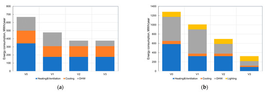 All the results of the calculations presented in Section 3.1, Section 3.2, Section 3.3 and Section 3.4 were summarized and tabulated. The projected effects of usable and final energy consumption are shown below. Figure 7 shows the structure of energy demand, considering such systems as heating and ventilation, cooling, domestic hot water, and lighting.
