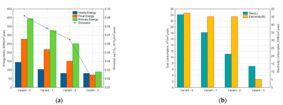 Summary of the energy performance of the building in each of the analyzed variants: (a) energy and carbon coefficients; (b) electricity (R—right axis) and gas (L—left axis) consumption.