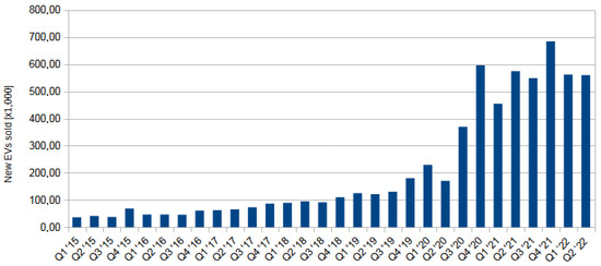Quarterly sales volumes of EVs in the EU from Q1 2014 to Q2 2022.