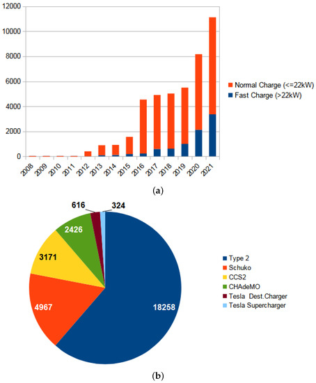 Figure 4a shows the levels of implementation of public charging stations in recent years. Weak points are also related to socket types available for EV recharges [