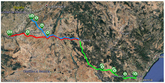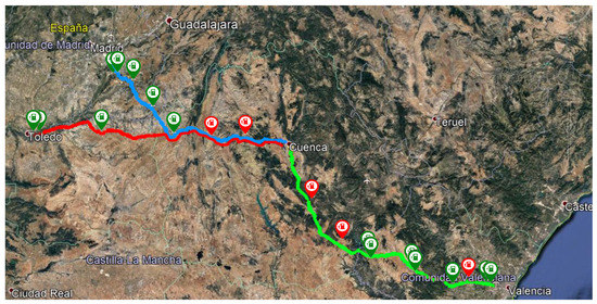 Actual charging stations on the routes starting from Cuenca to: Madrid (blue path), Valencia (green path) and Toledo (red path).