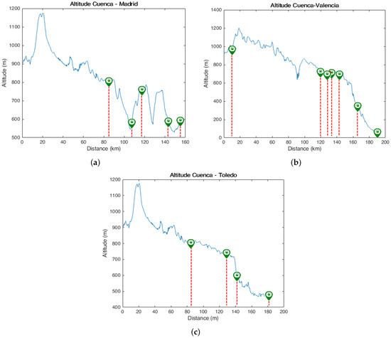 Altitude profile and charging stations on the routes: (a) Cuenca–Madrid, (b) Cuenca–Valencia, and (c) Cuenca–Toledo.