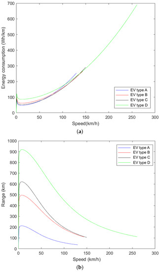 where, at the numerator, the effective electrical energy of the battery is reported, and at the denominator, all of the dissipative actions are reported. In particular, the presence of the auxiliary power consumption and the vehicle motion resistances are noticeable. The effect of the aerodynamic resistance contributes to sensibly decreasing the vehicle range for speeds higher than the threshold value of 50 km/h, as depicted in