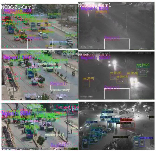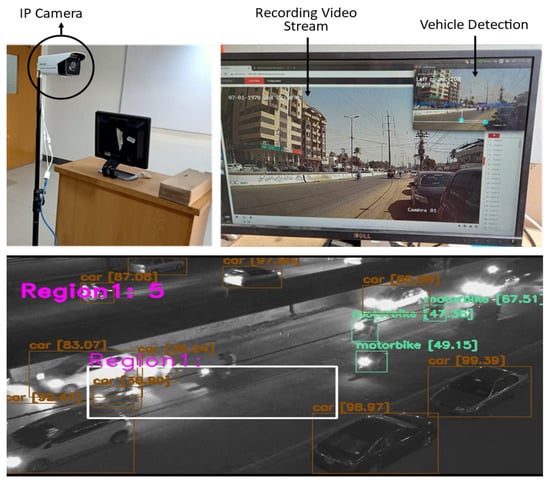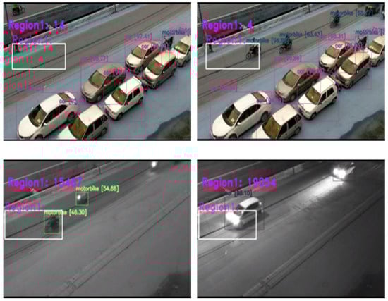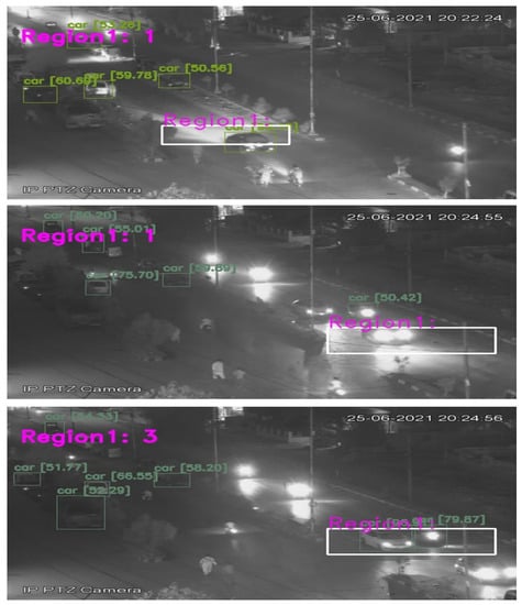 After detecting and recognizing the objects, it is essential to identify the stationary and non-stationary vehicles on the road, as vehicles parking on roads is very common. Thus, to determine if the vehicle is moving, YOLO is used with a combination of region-based techniques. An ROI is created, and the background model was developed for a user-generated region area, a region of interest (ROI). The essential step is to figure out how to transform the collected items into vehicle count data without detection and tracking. When a car passes across the ROI in subsequent frames, a portion of it is identified as a foreground object in each frame. The issue is determining how to count these items as single cars without repeating the process. To do so, each identified foreground region in each frame is assigned a number , where f and v, respectively, indicate the frame number and the vehicle label inside this frame (1:m). After that, each of these areas is compared to the regions identified in the preceding frame , where u = 1:n.