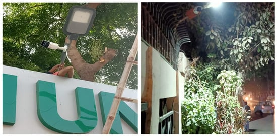 The experimental setup was placed at two different areas after careful consideration of the traffic flow. The first site was the ZU site, which is a road in front of Ziauddin University, Faculty of Engineering, Science, Technology and Management (ZFESTM), Block B, North Nazimabad, Karachi, whereas the second site is labeled as the SSUET site, which is an entrance road of Sir Syed University of Engineering and Technology, Gulshan-e-Iqbal, Karachi. The experimental setups on the selected sites are shown in Figure 3. The cameras are mounted on the side of the road. The reasons for choosing both sites were easy accessibility and there being nominal traffic flow on weekdays and weekends. Using Google Maps, we point out that both roads are about 1000 m long, and both roads have an average of 30 m between the streetlights, which provides excellent comparisons for the study of lighting schemes, as both sites have major traffic flow not only at day time but at night as well.