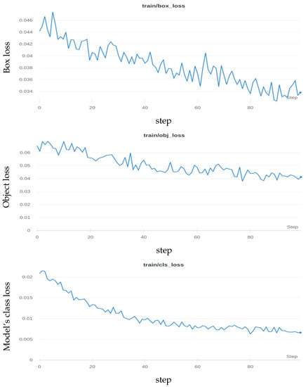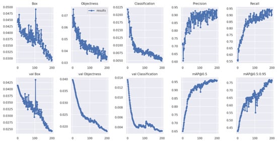 where represents true positives, which define the correct detection of objects; represents false negatives, and they are objects which were present but not detected by the algorithm; and represents false positives, which are invalid or incorrect detections of objects. Precision measures the percentage of accurate hits or predictions and is defined as the proportion of true positives of all positive results (both true positives and false positives). The recall defines the percentage of total relevant results correctly classified by the network. To determine if the prediction is a true positive or a false positive, intersection over union (IoU) has to be measured. The intersection over union (IoU) assesses the overlap area between the predicted bounding box and the actual item’s ground truth bounding box in object detection. Detection can be categorized as correct or wrong by comparing the IoU to a specified threshold. The accuracy of the algorithm is defined by the mAP, which is the proportion of true results (both true positives and true negatives) among the total number of cases examined. When computing mAP, intersection over union (IoU) is utilized. It is a value between 0 and 1 that indicates how much the anticipated and ground truth bounding boxes overlap. As each value of the IoU threshold yields a distinct average accuracy (AP) measure, this value must be specified. The result of evaluation of YOLOv5 model on NVIDIA Jetson Nano is shown in Figure 6 and summarized in Table 1.