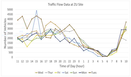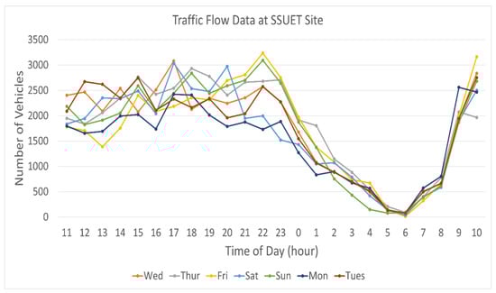 After identifying the vehicles in the video frame, the next step is to control the intensity of streetlights using the proposed approach and provide on-demand electrical energy. Figure 10 and Figure 11 show the statistical weekly vehicle profiles of both SSUET and ZU sites. It can be seen that these road traffic profiles are very similar over a week. From 11 p.m. in the evening, the number of vehicles on the road starts decreasing, and the vehicle counts are very low after 2 a.m. Starting at 7 a.m, the vehicle counts gradually increase at both sites. After 9 am, both sites have significant traffic flow.
