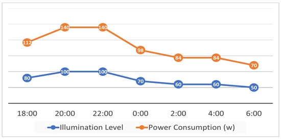 Normally, streetlights have to work for 10 to 12 h daily, which causes significant electricity usage using the traditional method. The proposed adaptive control system operates streetlights at different intensities for the optimization of energy consumption, depending on the vehicles on the road, at two sites. Figure 12 shows the average intensity level and power consumption of the streetlights during the twelve-hour operational cycle from 6 p.m. to 6 a.m. Due to the low availability of ambient light at 6:00 p.m, the intensity level or power consumption of streetlights was set to 80%. Power consumption is 112 watts with 80% intensity. There are working hours till 12 o’clock at night, and due to the large number of vehicles on the roads, the lights are run at maximum intensity and use 140 watts. Between 12 noon and 2 a.m, the average power consumption was reduced by 70% due to reduced traffic flow and used 98 watts. Due to less traffic on the road, between 2 a.m. and 4 a.m., the average power consumption was further reduced by 60%, and 84 watts was used. In addition, from 5 a.m. to 6 p.m., the average power consumption was further reduced by 50%, and only 70 watts was used.
