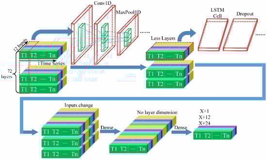 Figure 9. Two main modules, CNN and LSTM, are cascaded together in this system. The CNN layer is an in-depth feature extractor that integrates periodic information on building energy consumption with lower dimensionality than the original tensor. LSTM layers extract and learn temporal features of multivariate energy consumption time series. The three-dimensional (3D) tensor is input into the PBNN model. The three dimensions of the tensor are features (12 inputs in the figure), sliding window size (72 layers in the figure), and time span (time series in the figure).