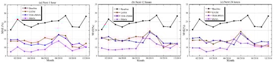 In most cases, the MAE of PBNN is the smallest, followed by TSW-PBNN and LSTM. The MAE of the baseline model is the largest. There are the following error trends in the prediction results of LSTM, TSW-PBNN, and PBNN. The MAE in January, February, and March is the average MAE for the whole year. MAE decreases in April, and increases slightly in May and June. MAEs in July, August, and September are significantly higher than the average MAE. The MAE in October hits rock bottom before increasing again in November and December.
