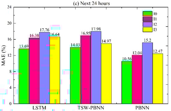 Figure 14c, the MAE of LSTM increases from 13.69% to 16.64% compared with I0 and I3. The MAE of PBNN increases from 10.56% to 12.47%. Energy consumption prediction errors do not increase significantly.