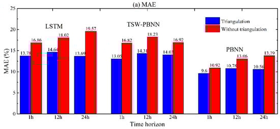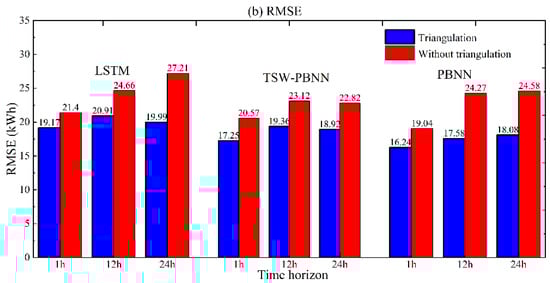 Figure 15. The energy consumption prediction error of LSTM with triangulation preprocessing is, on average, 4.11% lower than that without triangulation preprocessing. The average energy consumption prediction error of PBNN can be reduced by 2.28% through trigonometric function preprocessing. The calculation conclusion of the TSW-PBNN is similar to that of the PBNN. From the perspective of RMSE, trigonometric function preprocessing can reduce the energy consumption prediction errors of LSTM, TSW-PBNN, and PBNN by 4.40 kWh, 3.66 kWh, and 5.33 kWh, respectively. As the prediction time horizon increases, the energy consumption prediction errors of the model trained on the original features increase rapidly.