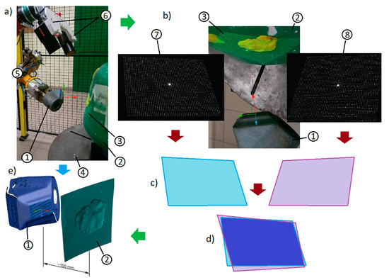 Figure 1. Stages of mapping the shape of the side surface of the working unit of the mining machine using the developed measuring method: (a) setting the cameras and laser projection device for the measurement; (b) acquisition of measurement images; (c) deformations of the grid of measurement points in the images; (d) transformation of the right image into the left image; (e) spatial model mapping the side surface in the area where the pick holder was mounted: 1—pick holder, 2—working unit, 3—projection of a marker grid, 4—positioner, 5—laser projection device, 6—stereovision system mounted on a robot, 7—image from the left camera, 8—image from the right camera. - image preprocessing (segmentation of measurement points) (Figure 1b),