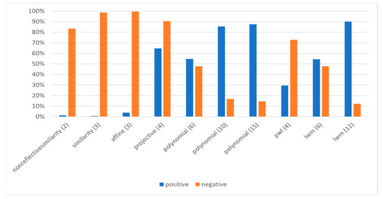 Share of correctly and incorrectly classified markers depending on the image transformation model used for a large search range (50 px) without removing previously classified markers from the images (the number of pairs of points necessary to determine the model parameters is given in brackets).