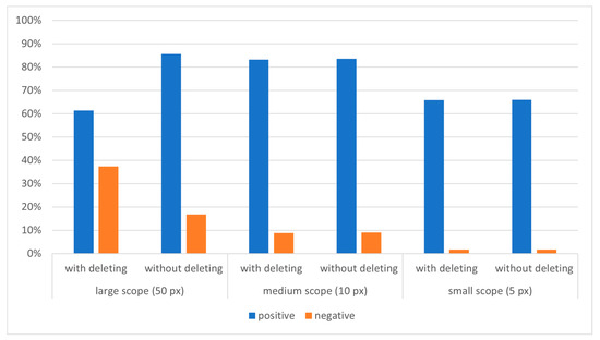 The results for this type of transformation are shown in Figure 4. It can be seen that the small search range (5 px) significantly reduced the number of incorrectly classified markers. Unfortunately, however, it also had a negative impact on the number of correct indications. A large search range (50 px) when removing previously classified markers ensured correctly matched markers at a level of 62%, with incorrectly matched markers at 38%. The number of correct indications when not removing previously classified markers was 86% and those incorrect were found to be 17%. Since the classified markers were not removed from the images, there occurred a situation where one marker could be matched several times. The medium search range (10 px) guaranteed a match of almost 85%, and a negative match of 8%, regardless of whether or not the previously classified markers were removed from the images. The remaining 7% of the marker grid points were not matched. Similarly, regardless of whether or not the previously classified markers were removed from the images, the number of correct indications for the small search range (5 px) was 67%, and incorrect was 1%. In general, to reduce the risk of incorrectly matching of a pair of markers in the images, it is advised that the smallest possible search range (≤10 px) is used. In doing so, the share of incorrectly classified points should not exceed 10%.