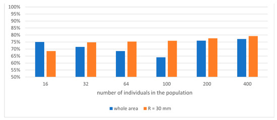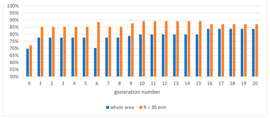 It was found that the larger the population of individuals, the greater the number of correctly classified points, especially in the central area of the point grid (Figure 6). When considring number of individuals, the population consisting of 400 individuals gave the best adaptation. The number of correctly classified markers here was close to 77% for the entire pattern, and 79% for the area with radius r = 30 mm. Genetic algorithms generally converge quickly to the optimal solution, however, a large number of generations is not indicated due to the need for long computational times [36]. Therefore, the conducted simulations examined the evolution of the population for 20 generations. In most of the simulations, the genetic algorithm converged after only a few generations, and the result was not improved with further iterations (Figure 7). The size of the area in which the adaptation function was checked (the number of points around the center of the grid) had a large impact on the results (Figure 8). Assessing the fit function over the entire area guaranteed a fit of at least 91% for the complete marker grid, and 76% for the area with radius R = 30 mm. On the other hand, the assessment of the adaptation function in the area with radius R = 30 mm guaranteed an adjustment of 89%, with 80% for the entire marker grid. Since it is particularly important to fit the central area of the marker grid, a further study was conducted with the objective function of assessing the matching of markers in the area within the radius R = 30 mm at the center of the pattern. Evaluation of the algorithm’s adaptation function in smaller areas only degraded the effectiveness of the alignment.