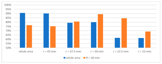 The results showed that with the reduction of the area around the center of the marker pattern in the images (from which the genetic algorithm selected the matching points for the image transformation), the optimal area for best matching of the marker pattern recorded on the pair of images decreased (Figure 19). The best fit for the entire pattern was obtained when a set of points matched among all pattern markers were used for image transformation. In the case when a set of matching points was used for image transformation among markers located in the radius rPD = 30 mm around the center of the pattern, the best fit was obtained for the area with radius R = 30 mm (however, with lower effectiveness of fitting points over the entire grid).