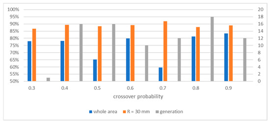 The share of correctly classified markers of the entire pattern and in the area with a radius of R = 30 mm around the center of the marker grid, and the number of the generation in which the genetic algorithm developed the best-suited individual depending on the probability of crossing.