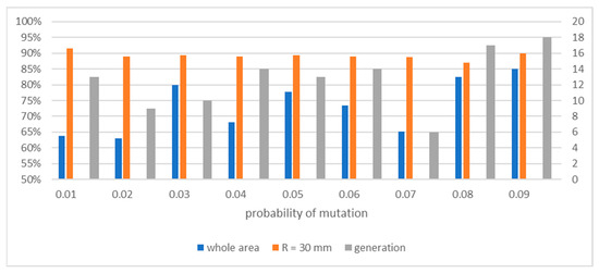 The share of correctly classified markers of the entire pattern and in the area with a radius of R = 30 mm around the center of the marker grid, and the number of the generation in which the genetic algorithm developed the best-suited individual depending on the probability of mutation.
