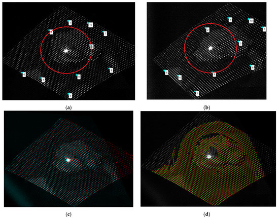 Set of 10 matching points (variant W1) with the best adaptation: (a) Left measurement image; (b) right measurement image; (c) anaglyph created by overlapping the right image after transformation onto the left image; (d) correctly matched markers—points in yellow and red (the red circle marks the area around the center of the marker grid delimited by a circle with radius R = 30 mm).