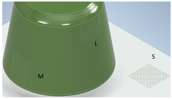 Marker grid projected onto a surface of various shapes: small deformation of the measurement point grid (S); medium deformation of the measurement point grid (M); large deformation of the measurement point grid (L).
