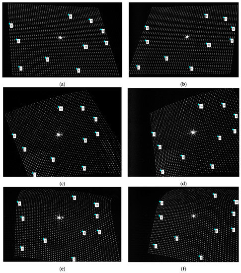 The arrangement of the matching points (variant W1) rotated to the right: (a,b) Images of the marker grid with small deformation; (c,d) images of the marker grid characterizing medium deformation; (e,f) images of the marker grid characterized by large deformation. Left column—images from the left camera, right column—images from the right camera.