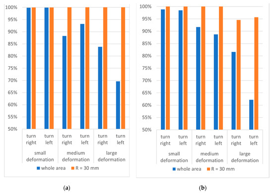 The share of positively matched markers for the entire pattern and in the area of radius R = 30 mm around the center of the marker grid, for three exemplary pairs of images, depending on the direction of rotation of the matching points without removing the classified markers: (a) Variant W1; (b) W2.