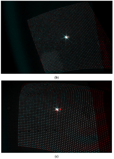 Anaglyphs created by overlaying the right-sided image after transformation onto the left one as a result of selecting a set of 10 matching points (variant W1) rotated to the right. Images of the marker grid: (a) Small deformation; (b) medium deformation; (c) large deformation.
