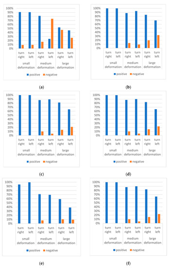 The share of positively and negatively matched markers for the entire pattern, for three example pairs of images, depending on the direction of rotation of the marker pattern: (a) Large search range (50 px) with marker removal; (b) large search range (50 px) without removing markers; (c) medium search range (10 px) with marker removal; (d) medium search range (10 px) without removing markers; (e) small (5 px) search range with marker removal; (f) small search range (5 px) without removing markers.