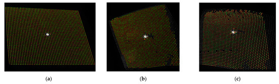 The proposed method of matching raster images requires in the first stage the indication of a set of 10 matching points, which are selected based on research. For the algorithm that searches for them and classifies them into pairs (and to recognize these specific markers from the rest), they should be distinguished in some way, preferably by shape or size. It is also possible to display separately the pattern of a set of ten markers and the pattern of the measurement markers. The laser works by diffracting one light source (2601 points). During the acquisition of measurement images, the laser was mounted on the gripper that positions a given pick holder to the side surface of the cutting head. Because the settings of each pick holder differed depending on the values describing the position in space of the pick tip, the size of the displayed pattern on the side surface changed. Depending on the shape of the side surface in the place where the pick holder was mounted, the pattern of markers displayed on it was characterized by different deformations. In the application of the laser, it is impossible to set up ten lasers in such a way that their beams intersect together at one point using beams generated by diffraction grating. Therefore, the use of a set of 10 lasers projected parallel to each other was considered. Using this method, the images from the stereovision system cover approximately the area of 100 × 100 mm, and the grid size of the markers displayed on the side surface of the cutting head ranges from 94 × 94 mm to 98 × 98 mm. The use of a laser constructed in this way ensures that the set of matching points will always be visible on the measurement images, regardless of the deformation of the marker grid. The marker grid displayed from one point is subject to deformation caused by, among other factors, the different lengths of rays falling onto the side surface (Figure 18). Therefore, we decided to investigate the effect of the clustering of the matching points towards the marker pattern’s centre on the effectiveness of matching the marker grid between the measurement images. For this purpose, a series of simulations were performed in which the area around the center of the marker pattern in the images was gradually reduced, from which the genetic algorithm selected the matching points for the image transformation. The entire area of the grid was used with rPD = 15 mm, rPD = 22.5 mm, rPD = 30 mm, rPD = 37.5 mm, and rPD = 45 mm.