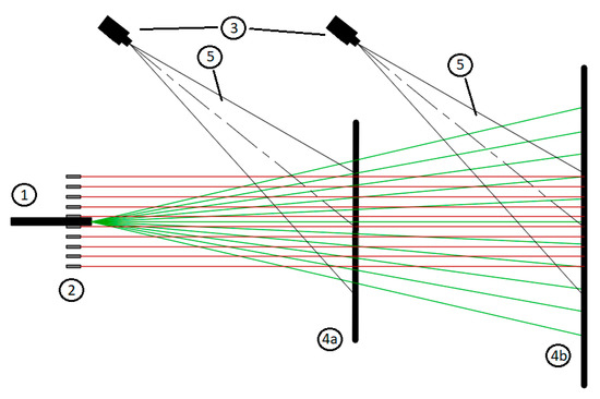 Diagram showing (1) a laser projection device, (2) an additional laser device, and (3) a set of cameras: (4a)—projection plane close to the projection device; (4b)—projection plane at a distance from the projection device, (5)—camera field of view.