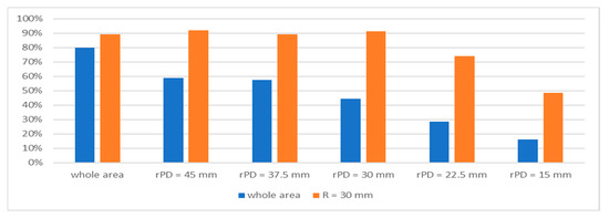 The share of positively matched markers for the entire pattern and in the area of radius R = 30 mm around the center of the marker grid, depending on the size of the area around the center of the images, from which points for image transformation were selected (rPD—radius of the circle around the center of the marker grid delimiting the area in which matching points were located).