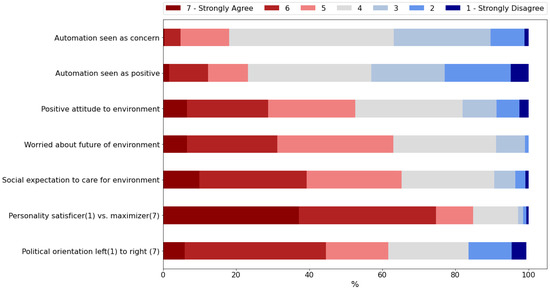 An overview of the psychographic scores is provided in Figure 2. The scores for each topic were calculated as the average value of a respondent’s answers to all the associated questions from Table A1 in the Appendix A. With regards to automation, only 18% of respondents have concerns about unintended effects of automation, while slightly more (23%) of the respondents believe that automatic control of their household appliances could have a positive effect on their electricity costs and daily comfort. Regarding the environment, about half (53%) of the respondents have a positive attitude towards the environment, and an even larger share (63%) of respondents say that they are concerned about the future of the environment. Overall, 65% of respondents report a social expectation to support the environment. Regarding personality, most respondents (85%) in our sample could be regarded as satisficers, i.e., they are not worried about always finding the best possible solution. With regards to political orientation, 62% of respondents would describe themselves as oriented towards the left.