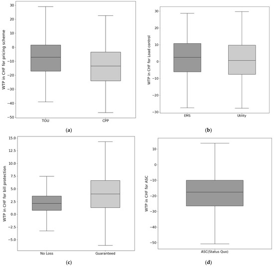 WTP distribution of the MXL-C model for: (a) pricing scheme, (b) load control approach, (c) bill protection and (d) ASC parameters.