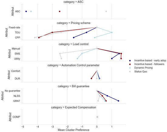 Cluster 1 is characterized by a strongly negative mean valuation parameter for the ASC. This indicates a general openness to DR tariffs. With respect to the pricing scheme, this cluster shows preferences for fixed-rate pricing schemes. Regarding the load control attribute, this cluster reveals above-average preferences for automatic control by an EMS. Likewise, control by the utility is preferred over manual control. The preference structure of Cluster 2 shows a very similar shape to Cluster 1. Respondents in this cluster reveal a negative preference for the ASC. However, the parameter shows a lower magnitude compared to Cluster 1 and to the full sample. This means that respondents in Cluster 2 are less likely to choose a DR tariff or in other words, require a higher compensation to opt for one of the DR tariffs. With respect to the pricing scheme attribute, it appears that Cluster 2 indicate strong preferences for a fixed-rate price. However, the aversion to dynamic pricing schemes is higher than in Cluster 1, which is expressed by the strongly negative valuation parameters. Cluster 2 also shows strong preferences for automatic load control by an EMS or direct load control by the utility. However, compared to Cluster 1, Cluster 2 is indifferent between these two options. Clusters 1 and 2 each show a preference structure that can be described as a preference for incentive-based tariffs. Due to the lower compensation demands of Cluster 1, this group can be described as early adopters and Cluster 2 can be described as followers due to the higher compensation requirements.