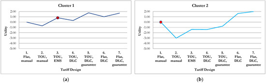 Based on the average utilities of different contract attributes for each respondent cluster from the previous section (Table 6), we have calculated the expected utility of different tariff designs for each cluster in Figure 5. The utility which a respondent cluster attaches to a contract is calculated as the sum of utilities for the respective respondent cluster and contract attributes and is described in more detail in Appendix B. Many energy suppliers nowadays offer a menu including a flat-tariff (which does not enable automatic load control) and a TOU tariff (which could be combined with manual load control, or automatic load control by an EMS or by the utility). This corresponds to the first four tariff options in Table A2. In Figure 5, we have highlighted the tariff approach, which the customers from each cluster would prefer in that case using a red dot. While customers from Cluster 2 and Cluster 4 are unlikely to sign up for a TOU tariff, and customers from Cluster 3 would prefer approach 2 (TOU, manual), the customers from Cluster 1 are likely to choose tariff approach 3 (TOU, EMS), which may lead to rebound peaks.
