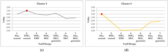 Expected average utility of different tariff designs for customers from: (a) Cluster 1, (b) Cluster 2, (c) Cluster 3 and (d) Cluster 4. Red dots indicate which of the tariff designs 1–4 is preferred.