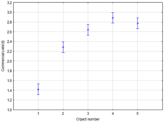 To illustrate the variability of the bean yield results, which depends on the applied fertilizer, a variance was used. This is the basic measure that describes the variability of the results and demonstrates how significant the variations in the results are in a given set of results (a variable). In other words, variance shows whether the results are more concentrated around the mean, i.e., the differences between the mean and the individual scores are significant, or whether the results are highly dispersed, i.e., the difference between the individual scores and the mean is large. The analysis of variance was performed with a single categorical predictor. The Tukey test, which is one of the most frequently used tests for comparing mean pairs, was used to illustrate which bean yield results varied significantly. In Table 8, the letters (a, b, c, and d) represent homogeneous groups of bean yields in terms of size. The Tukey test can be used for different sample sizes. It is based on the studentized range statistics distribution. Tukey’s method is more conservative than Fisher’s least significant difference (LSD) test but is less conservative than the Scheffé test. The experiment error rate for all pairwise comparisons remains the error rate for the set. This means that if a statistical significance level of α = 0.05 is adopted for the ANOVA test, the same level of statistical significance will be used for all pairwise (sample) comparisons. This procedure is used when the assumption of equal variance in the samples is met.