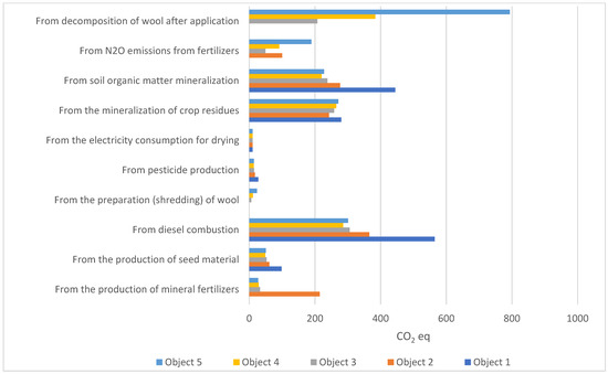 Manure or other organic materials used for fertilization can generate up to 80% of total GHG emissions when used as intensive organic fertilization [55]. On the other hand, Hakala et al. [64] found that fertilization with green manure of various types of grasses resulted in lower levels of GHG emissions per unit mass of product compared to intensive mineral fertilization. However, the size of the yield obtained in the objects fertilized with mineral fertilizers was several times higher than with organic fertilizers. The value of GHG emissions from agricultural production should always be considered in light of the yield obtained from the cultivated area. Using organic materials as fertilizers is related to the problem of their subsequent impact on the mineralization of organic compounds in the soil. The correct direction of agricultural production management toward increasing carbon sequestration is toward converting biomass to obtain compounds that mineralize more slowly [56,61]. The results of the conducted research show that the emissions of GHGs from the decomposition of wool after its introduction into the soil ranged from 207.5 to 794.2 kg CO2 eq/1 t of seeds (Figure 2). CO2 emissions from the decomposition of wool in the subsequent experimental objects accounted for 18%, 28%, and 42% of the total amount of GHGs from the production of beans.