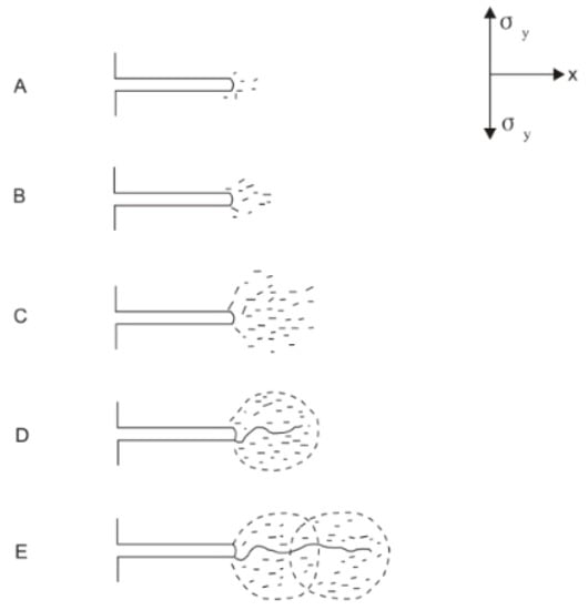 The traditional theory of the rock fracture process proposed by Atkinson et al. [24] holds that, when loading a cracked specimen with materials such as rock or ceramics as the medium, the fracture process should be as shown in Figure 1. From stage A to stage E in Figure 1, as the stress continues to increase, micro-cracks develop and finally form macro-cracks and expand forward. Stage A: Initially due to stress concentration, a small number of microscopic cracks isolated from each other are formed at the crack tip. Stage B: As the load continues to increase, the high stress range near the crack tip expands and companying the number of microcracks increases, while the microcracks are still relatively isolated; thus, the overall structure maintains linear elastic properties. Stage C: The microcracks continue to increase, some microcracks even begin to affect each other, and the end region of the cracks begins to exhibit nonlinear properties. Stage D: In the fully developed process region, the microcracks are connected with each other, leading to macro crack propagation. Stage E: With the movement of the pre-macro crack process region, the macro crack further expands. The description of stage E in traditional fracture process theory implies that the development of the process zone precedes the expansion of macroscopic fractures, and the macroscopic fractures do not extend beyond the current process zone.