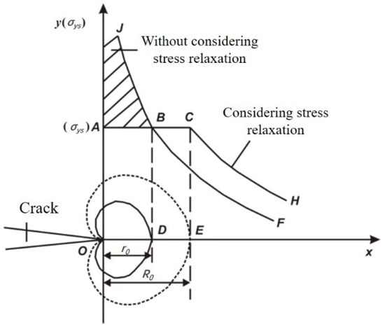 It is worth noting that Irwin’s theoretical calculation does not consider the influence of the stress relaxation effect in the process zone. This effect can reduce the degree of stress concentration in the process zone so that the maximum true stress in the process zone is lower than the theoretically calculated maximum stress. The area range increases, even if the real process zone size r0 is larger than the theoretically calculated value in Equation (2), specifically as is shown in Figure 3.