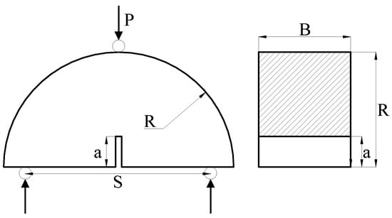 where KIC is the type-I fracture toughness, Pmax is the peak load, a is the length of artificial prefabricated cracks, B is the thickness of the specimen, R is the radius of the semi-disk NSCB specimen, and Y′ is the infinite amount determined by the shape of the specimen and the loading conditions. In the recommended standard of ISRM, the calculation formula of Y′ under the condition of plane stress is given as follows: