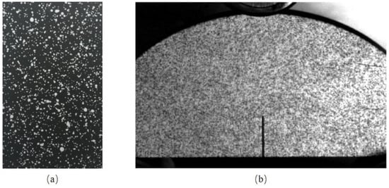 In order to use DIC equipment to observe the deformation of the surface of the sample in the experiment, the surface of the sample was painted and colored (Figure 7) to create speckle observation points. The specific operation was as follows: firstly, the surface of the test piece was sprayed with black paint evenly to form a single background color, and, after drying, it was sprayed with white paint that highly contrasted with the background color to make speckle observation points, ensuring that the sizes of the speckles were the same and the distribution was uniform and irregular.