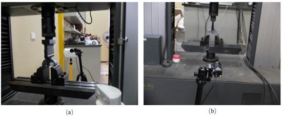 As shown in Figure 8, this paper used the electronic universal testing machine (MTS-SANS CMT5504/5105, made in Shanghai, China, by MTS) to carry out the non-cracked cuboid thin plate test and the NSCB test. The equipment can apply a maximum load of 100 kN and set the loading speed to 0.06 mm/min. In the experiment, a digital camera (MV-VD500SM/SC, made in Xi’an, China, by Microvision) was used to record the development of the process zone near the crack and the crack expansion. For the non-cracked cuboid compression test and the NSCB test, the cameras were set to shoot the frequency of 10 and 2 per second, respectively. A roller-type loading fixture was used to carry out three-point bending loading to avoid side load on the specimen, and the loading form is shown in Figure 9.