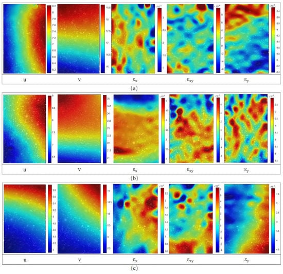 According to the order in which the speckle photos were collected and compared with the fracture time of the sample observed in the experiment, three photos corresponding to the fracture time were chosen from many photos, which were defined as before the fracture, during the fracture, and after the fracture. By inputting the speckle photos at various stages in the test process, the latter photo was only slightly deformed compared to the previous photo, so that the NCORR software could accurately match according to its internal algorithm and then compare the speckle before the fracture. The differences between the photo and the no-load reference speckle photo, the distribution cloud map of the horizontal displacement V, vertical displacement U, horizontal strain εy, vertical strain εx, and shear strain εxy of each specimen before the fracture occurred are shown in Figure 14, Figure 15 and Figure 16; the displacement field and strain field of a typical specimen before failure and the speckle photos taken before and after failure are shown under the three loading methods.