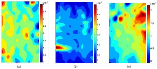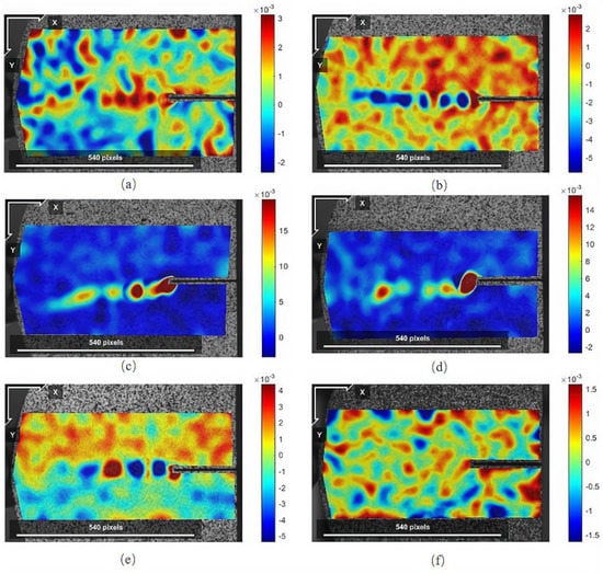 MATLAB was used to compile simple data processing commands, and the distribution data of εx, εy, and εxy obtained by the NCORR software were used to calculate the distribution data of the maximum principal strain ε1 of the specimen before failure and to visualize the calculation result as the maximum principal strain and distribute it in the cloud map, as shown in Figure 12.