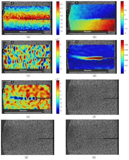 When the NCORR software processes the speckle image, the unit of the output displacement field is pixel. Taking the line segment with a length of 540 pixels in Figure 16 as the reference, the length of each pixel of the NSCB test photo was calculated to be about 0.055 mm. Based on this, the strain field at the crack tip of the specimen was analyzed, and it was found that the horizontal strain εy near the prefabricated crack tip before the fracture was significantly larger than the vertical strain εx and shear strain εxy, indicating that the region near the tip was mainly deformed in the horizontal direction (perpendicular to the crack direction). The shape of the high-strain region on the horizontal strain εy distribution map had a certain similarity with the shape of the new macroscopic crack after the fracture occurred.